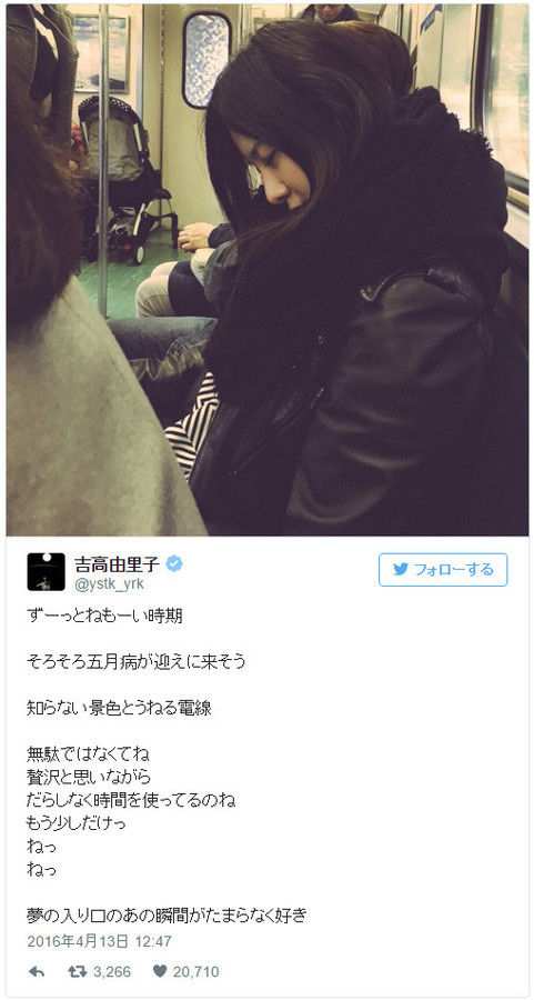 吉高由里子が電車の中で居眠り パシャ 2016年04月18日 カテゴリ:芸能・エンタテイメントおもしろ・ネタ 1: ファイナルカット(東日本)@\(^o^)/ 2016/04/18(月) 11:09:41.44 ID:0DViuL1U0.net BE:837857943-PLT(16930) ポイント特典 女優の吉高由里子が13日、電車で居眠りする自身の姿をTwitterで公開し、ファンから驚きの声が上がっている。 http://headlines.yahoo.co.jp/hl?a=20160415-00000037-flix-ent 【吉高由里子が電車の中で居眠り パシャ】の続きを読む